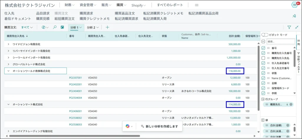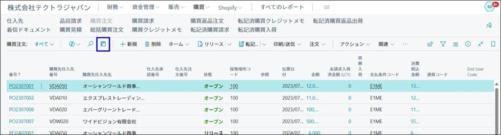 まず、「購買注文」リスト画面で「分析モード」(解析モード)のアイコンを選択します。