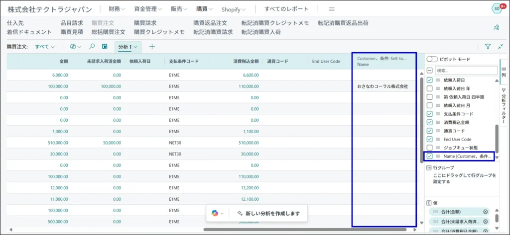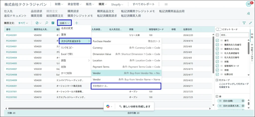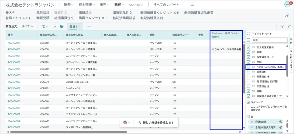 具体的にどのように実現できるのかを「購買注文」リスト画面を例に、購買注文に紐付けられている得意先がある場合はその得意先を追加表示するケースで説明します。