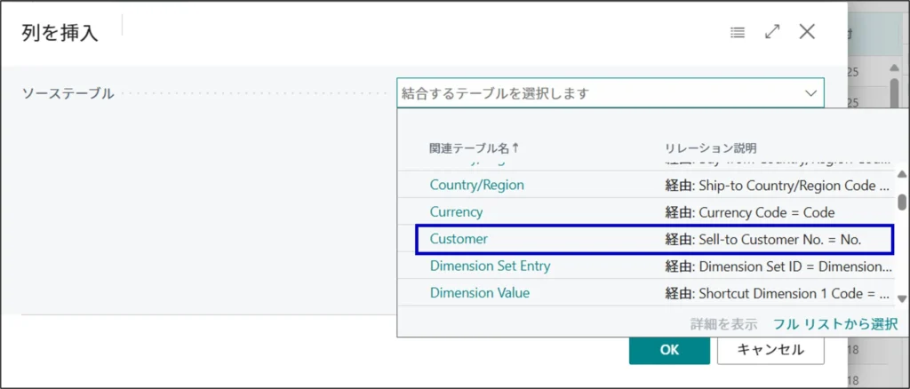 「列を挿入」画面が表示されるので、「結合するテーブルを選択します」の「v」を選択してテーブルのリストを表示し、目的のテーブルを選択します。