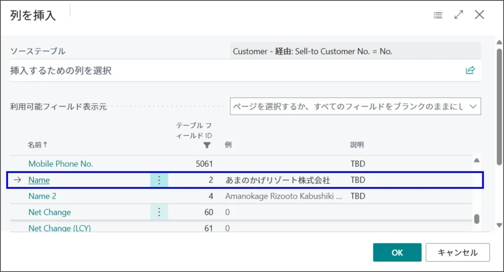 選択したテーブルに含まれるフィールドのリストが表示されるので、目的のフィールドを選択します。