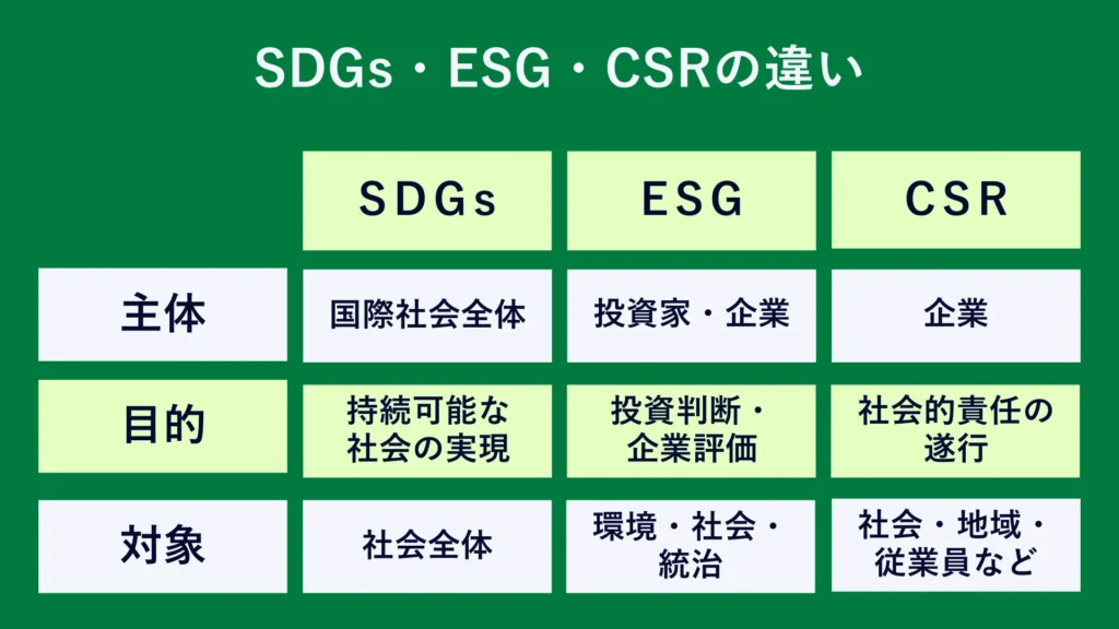 サステナビリティという言葉と付随してよく聞かれるのが、SDGs、ESG、CSRです。しかし、SDGs、ESG、CSRの違いを明確に説明できる方は少ないのではないでしょうか?ここでは、それぞれについて解説し、違いを整理していきます。