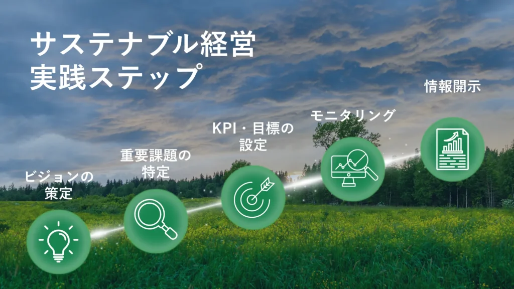 まず、最初のステップとして、企業活動が社会や環境へどのように影響を与えているかを捉え、どのような未来を描くのかを明確にする必要があります。その中で、サスティナビリティに関する企業の理念や価値観を明確にしていきます。